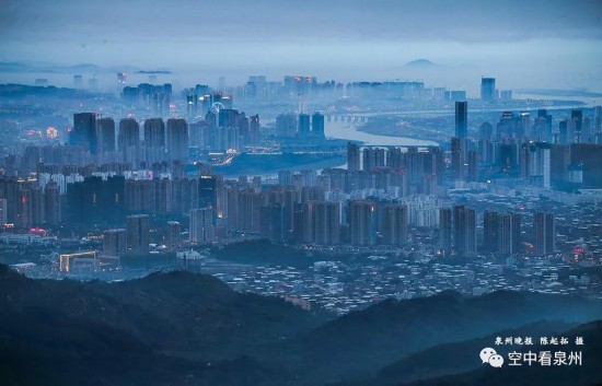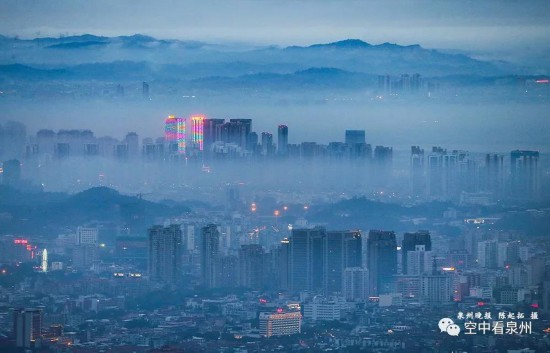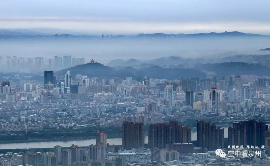 上圖:3月9日傍晚,雨水初歇,從晉江紫帽山往泉州中心市區(qū)方向眺望,平流霧猶如薄紗,將這座城市打扮出朦朧美。