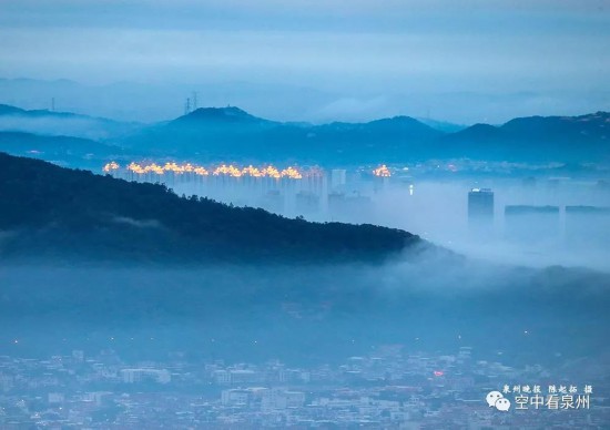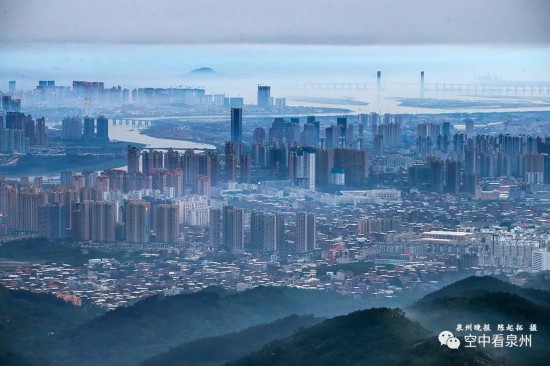 沿江而下,視角平移,泉州軟件園方向,可見(jiàn)雙陽(yáng)山高聳入云,山頭隱沒(méi)在云霧之中。