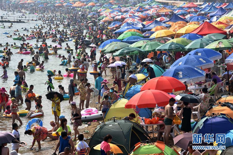 7月28日,游客在遼寧大連付家莊海濱浴場戲水消暑。