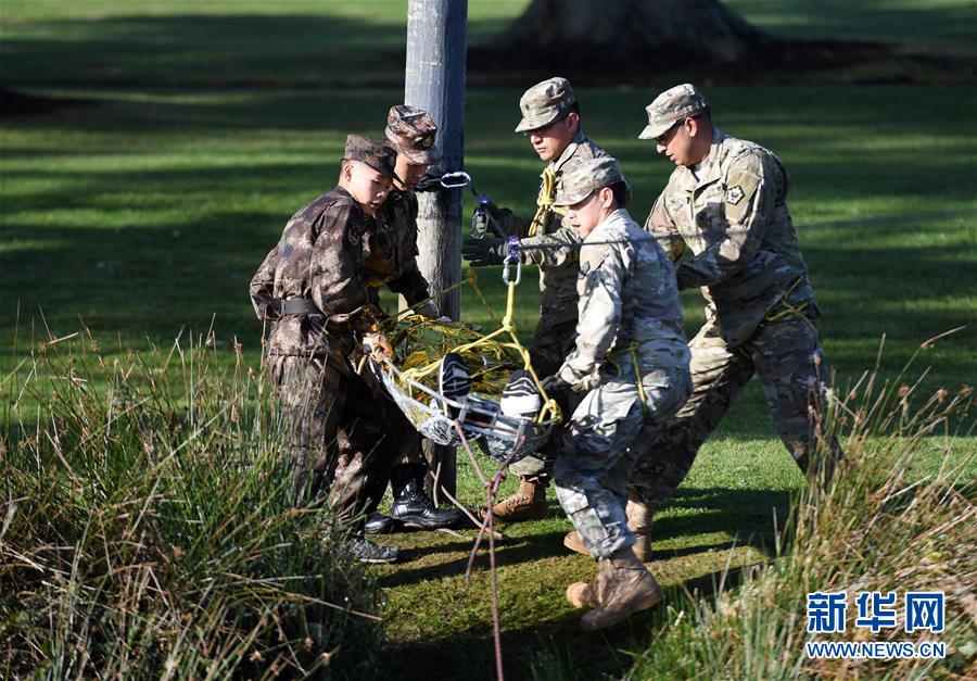11月18日,在美國俄勒岡州錫賽德的國民警衛(wèi)隊拉里葉軍營,中美兩軍參演人員一同運(yùn)送“傷員”。中美兩軍人道主義救援減災(zāi)聯(lián)合實兵演練當(dāng)日進(jìn)入第三天。此次聯(lián)合演練中美兩軍共派出200余人參加。新華社記者殷博古攝 -