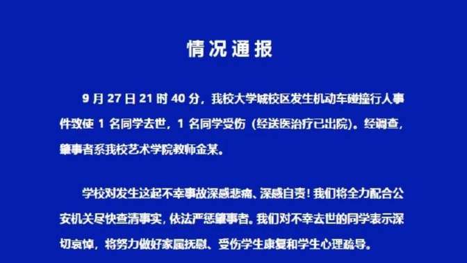 華南理工大學(xué)通報“校內(nèi)發(fā)生車禍致1死1傷”:肇事者系學(xué)校教師,將全力配合公安機關(guān)盡快查清事實,依法嚴(yán)懲肇事者
