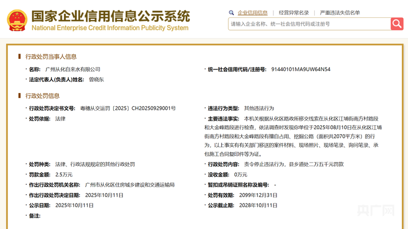 廣州從化自來水有限公司因擅自占用挖掘公路被罰2.5萬元
