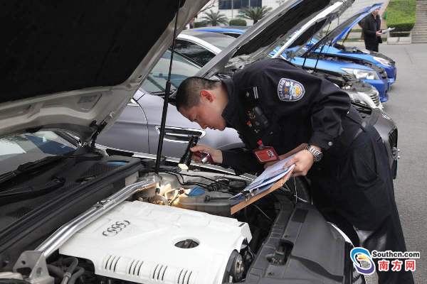 交警對改裝車進(jìn)行檢查。