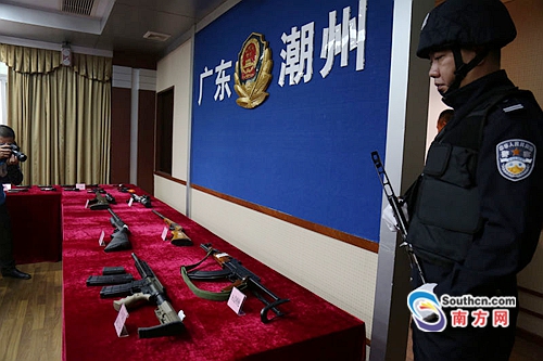 當(dāng)日,潮州市公安局向媒體通報(bào)“2.15”特大非法買賣、持有槍支彈藥案。潮州市公安局副局長(zhǎng)嚴(yán)照雄介紹,該團(tuán)伙以網(wǎng)絡(luò)販槍為主,其隱蔽性、跨區(qū)域性等特點(diǎn)令案件偵破具有很大困難。據(jù)查,這些槍支均為槍支愛好者玩槍所用,目前尚未發(fā)現(xiàn)有用于作案。