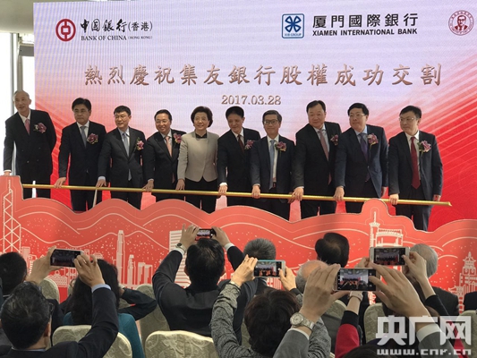 央廣網(wǎng)香港3月28日消息(記者周偉琪)廈門(mén)國(guó)際銀行股份有限公司(下稱(chēng)“廈門(mén)國(guó)際銀行”)、福建省廈門(mén)市私立集美學(xué)校委員會(huì)(下稱(chēng)“集美校委會(huì)”)與中國(guó)銀行(香港)有限公司(下稱(chēng)“中銀香港”)在香港聯(lián)合舉行集友銀行股權(quán)成功交割儀式,慶祝集友銀行股權(quán)買(mǎi)賣(mài)所有工作全部順利完成。中央人民政府駐香港特別行政區(qū)聯(lián)絡(luò)辦公室副主任仇鴻,福建省委常委、常務(wù)副省長(zhǎng)張志南,中國(guó)銀行行長(zhǎng)陳四清,香港金融管理局副總裁阮國(guó)恒,中國(guó)銀行副行長(zhǎng)任德奇,中銀香港副董事長(zhǎng)兼總裁岳毅,廈門(mén)市委常委、廈門(mén)統(tǒng)戰(zhàn)部部長(zhǎng)兼集美校委會(huì)主任張燦民、廈門(mén)國(guó)際銀行總裁呂耀明、集友銀行管理層代表及社會(huì)各界人士參加了儀式。香港福建社團(tuán)聯(lián)會(huì)吳良好主席等福建鄉(xiāng)賢、香港各界人士、集友銀行客戶(hù)及員工代表等亦蒞臨儀式現(xiàn)場(chǎng),共同見(jiàn)證集友銀行在發(fā)展史上揭開(kāi)新的一章。