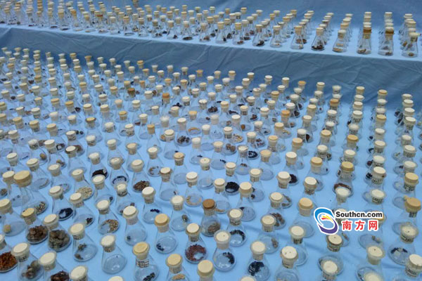 南方網(wǎng)訊 大的像小石子一樣潔白,小的則像高粱一樣紅潤光澤,還有像芝麻粉一樣的散碎結(jié)石……近日,在東莞市南城醫(yī)院舉行的學(xué)術(shù)培訓(xùn)班上,南城醫(yī)院副院長王三貴多年來的“珍藏”——2300多份結(jié)石標(biāo)本擺在會議現(xiàn)場,因為五顏六色、形狀各異,同事將其稱為“五谷雜糧”,也令參觀者嘆為觀止。