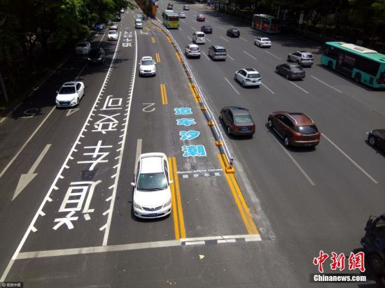 據(jù)中新網(wǎng)報(bào)道,4月17日,廣東深圳,全國首條應(yīng)用遙控移動(dòng)護(hù)欄燈控的潮汐車道亮相深圳市南山區(qū)深南南新路口。據(jù)介紹,遙控移動(dòng)護(hù)欄的學(xué)名為“馬路機(jī)器人”,“馬路機(jī)器人”的應(yīng)用讓潮汐車道和對向車道間有了物理隔離,這條潮汐車道也被形容為“會(huì)走路的潮汐車道”。鄒碧雄 攝 圖片來源:視覺中國