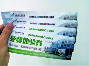 算上往返,你需要兩張免費(fèi)體驗(yàn)券——從莞去深的是綠色券,從深返莞的是藍(lán)色券。怎么領(lǐng)券?使用你的學(xué)生證,到松山湖城市候機(jī)樓就能免費(fèi)領(lǐng)取。