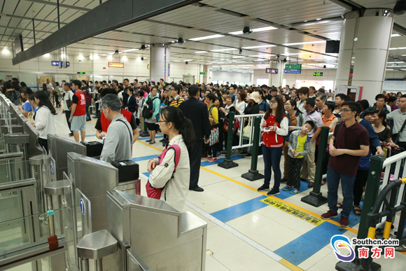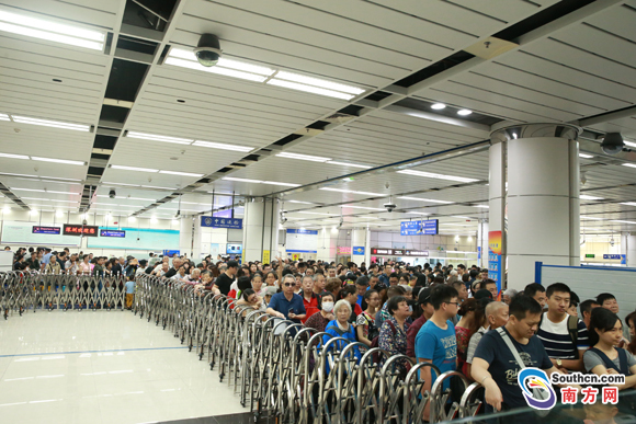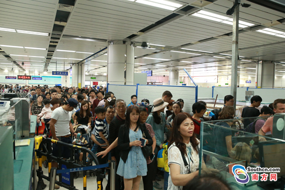 客流高峰時段,通道內(nèi)擠滿了排隊候檢旅客。