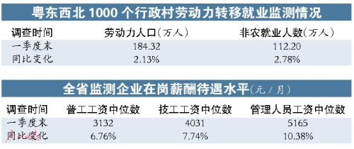 粵東西北1000個行政村勞動力轉(zhuǎn)移就業(yè)監(jiān)測顯示,勞動力人口184.32萬人,占總?cè)丝?1.57%,同比上升2.13個百分點(diǎn);其中非農(nóng)就業(yè)人數(shù)112.20萬人,占勞動力人口60.87%,同比上升2.78個百分點(diǎn)。