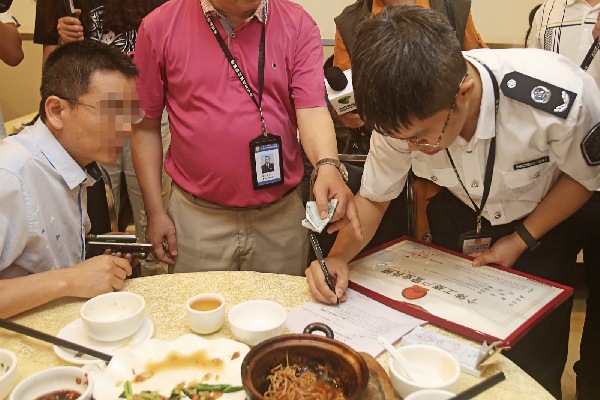 8日晚上7點準(zhǔn),督查人員就隨機抽查羅湖區(qū)鳳凰鳳山大廈附近餐飲服務(wù)場所控?zé)熐闆r。這個點正是用餐的高峰期,對于執(zhí)法人員的突然"殺到",餐館工作人員及用餐者都感到有些詫異有些緊張。執(zhí)法人員以最快的速度,最尖銳的眼力巡查餐館的每一個角落。突擊檢查的前兩家餐館香港新發(fā)燒臘餐館(黃貝嶺店)和巴蜀風(fēng)都未發(fā)現(xiàn)有人抽煙,整體情況良好。