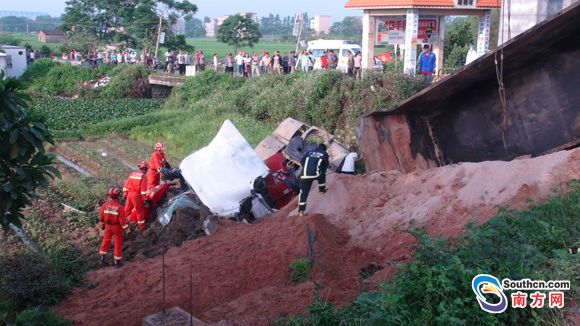 消防官兵到場后發(fā)現(xiàn),貨車與小車雙雙側(cè)翻沖出了公路掉進(jìn)了路旁的深溝,而貨車車身則壓住了小車,并將其完全砸扁,車上所載的沙石也將小車掩埋了大半,只有車頭部分裸露在外。另外,貨車車頭已深深地插進(jìn)了深溝的淤泥中。