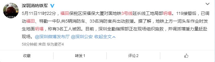 119接警后,已調動福田、特勤一中隊共5輛消防車、33名消防官兵出動救援。據了解,地鐵上方一泥頭車作業(yè)時發(fā)生地面坍塌,稱有3名工人被困。