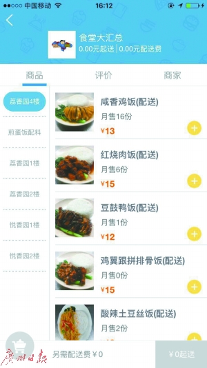 記者下載了該訂餐軟件,在該外賣平臺上,共有五個(gè)可供學(xué)生選擇的窗口,分別是悅香園二樓、荔香園二樓、荔香園四樓、荔香園一樓和悅香園一樓。每個(gè)窗口提供3~9種餐食,包括水餃、拉面、米飯粥等。除配送外,這些窗口還可以選擇打包自取。同樣的餐食如果自取,將會(huì)優(yōu)惠1.5元。該平臺公告欄上顯示,食堂提供的送餐服務(wù)僅僅是中餐和晚餐飯點(diǎn)的配送。而且據(jù)了解,“校食易”上的一些菜式是窗口沒有的。