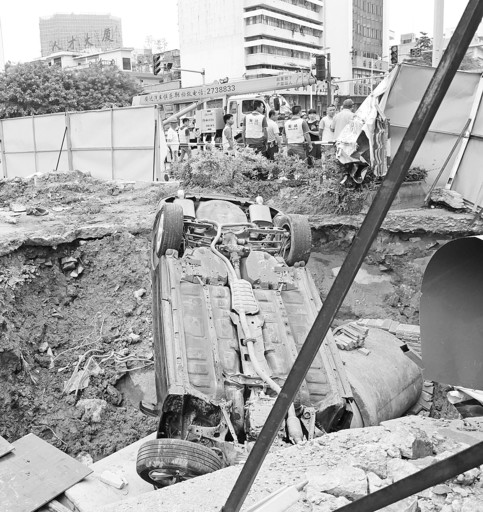 肇事車輛沖進人民北路工地大坑里。 西江日報記者 吳威豪 攝