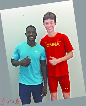 吳瑞庭(右)與世界百米飛人加特林合影。