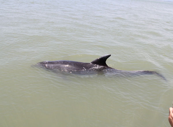 5月30日上午8時許,在海陵灣陽江港附近海灘游玩的群眾看到海灘上有一只受困的黑色海豚,迅速報警求助?吹胶k嗌眢w露在水外,可能有生命危險,群眾一起將海豚往水里推了十幾米,但海豚仍不能游回大海,只能在近海淺水里慢速游動。