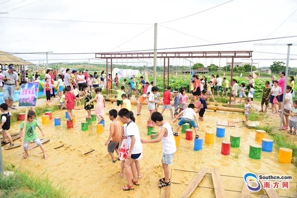 在廣源荷花世界,一望無際的荷花讓人心曠神怡,或盛開或含苞待放的荷花飄著清香,清風吹過,荷葉翻卷著蕩起一波綠色的浪潮。舞臺上載歌載舞,客家山歌《打個山歌過橫排》、市級非遺保護項目《龜蚌舞》將節(jié)目帶到了高潮。龜蚌舞是頓崗鎮(zhèn)的一種民間藝術,演員們表演形象生動、熱情洋溢,贏得了游客們的陣陣掌聲!百p荷花、采蓮蓬”親子活動也吸引了眾多小朋友。