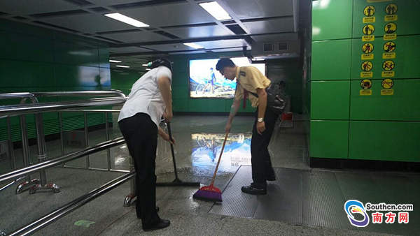 據(jù)南方網(wǎng)報道,7月17日下午,廣州地鐵3號線客村站站臺內(nèi)發(fā)生漏水。據(jù)現(xiàn)場目擊者江女士稱,漏水點位于該站3號線與8號線夾層間的一間房屋,水從房間門縫流出后,經(jīng)天花板落至3號線候車月臺,乘客乘車受到影響!败囌纠锖孟裣掠暌粯。”江女士稱。目前,臨近流水點的扶梯已經(jīng)停運(yùn),漏水原因仍在調(diào)查中。