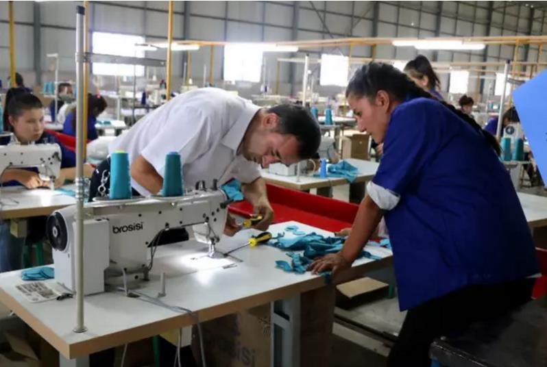 在伽師縣宇信服裝有限公司的工廠內(nèi),帶隊老師主動承擔(dān)起機(jī)器的維修工作,確保學(xué)生能夠正常工作。