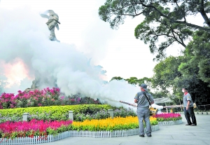近日工作人員在越秀公園的五羊雕像下噴藥滅蚊。廣州日?qǐng)?bào)全媒體記者邱偉榮攝