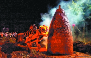 據介紹,今年的番塔高約4.68米,塔基直徑2.18米,由2400多塊新磚組成。砌番塔時很有講究,每一塊磚都是交錯相連。番塔每往上壘一層,就要往內部收緊一圈,最上層頂端僅留一個直徑約20厘米的小孔。這樣類似“火山噴發(fā)”結構的塔身,能夠讓火星和火苗在一瞬間就從頂端的小孔噴涌而出,最高可噴出2米。