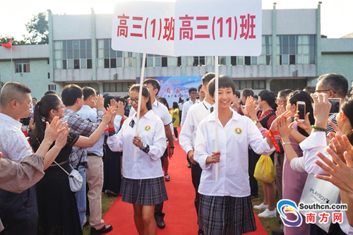 鮮花、拱門、紅地毯……16日,廣東實驗中學(xué)附屬天河學(xué)校(下稱“省實附中”)室內(nèi)體育館張燈結(jié)彩,省實附中2018屆高三學(xué)子在這里舉行成人禮。