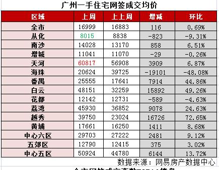 均價方面,上周廣州一手住宅網(wǎng)簽均價為16999元/平方米,環(huán)比微增0.69%,均價未發(fā)生太大變化。