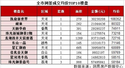盡管均價偏高與高端住宅成交密不可分,不過在上周的天河,僑鑫匯悅臺、尚東柏悅府等高價樓盤均無成交記錄。即便如此,上周成交均價最高的6個樓盤中,天河占據(jù)4個。凱旋新世界上周成交一套279平方米住宅,單價為108352元/平方米,成為上周最貴。天河的峻林均價超過8萬元,番禺的天頤華府,天河珠光新城御景2期、龍湖首開天宸原著,越秀的東山一品上周均價也在7萬元以上。