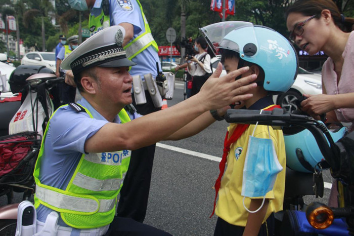 對電動車不帶頭盔和行人闖紅燈的行為進(jìn)行勸阻。鶴山交警聯(lián)合志愿者在城區(qū)各個路口都設(shè)置了勸導(dǎo)崗,對行人闖紅燈和電動車不戴頭盔等違法行為都進(jìn)行勸阻,告知其危害。同時,贈送了一大批頭盔給鶴山市民。