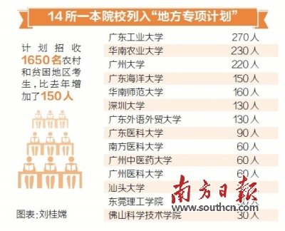 據(jù)統(tǒng)計(jì),廣東14所第一批本科院校列入“地方專(zhuān)項(xiàng)計(jì)劃”,計(jì)劃招收1650名農(nóng)村和貧困地區(qū)考生,比去年增加了150人。