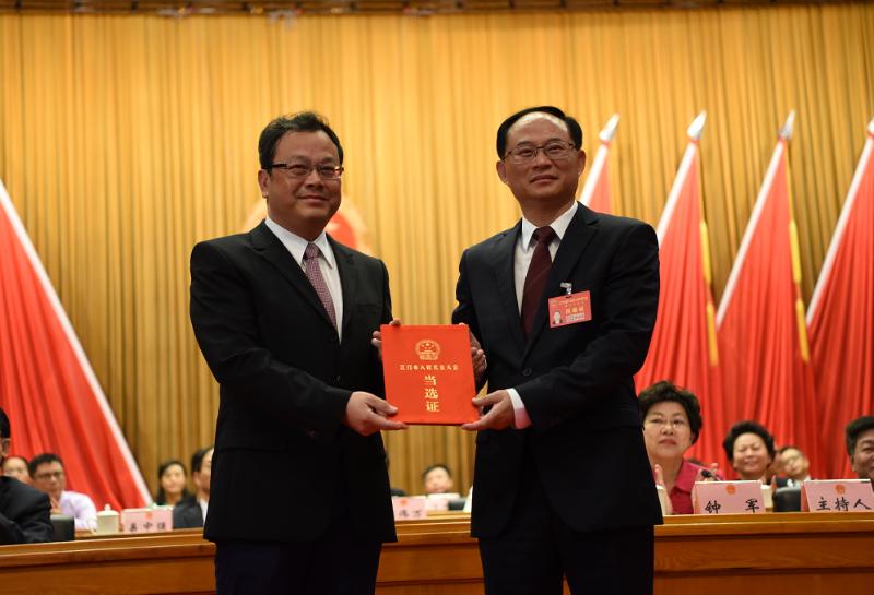 市委書記、市人大常委會(huì)主任林應(yīng)武代表大會(huì)主席團(tuán)為新當(dāng)選的市長劉毅頒發(fā)當(dāng)選證。