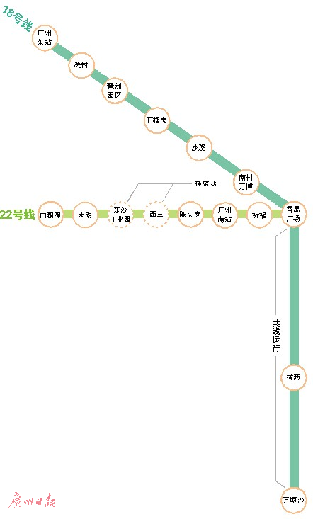 根據(jù)批復,22號線由番禺廣場至白鵝潭,連接廣州南站和白鵝潭樞紐,全長31公里。線路共設番禺廣場、白鵝潭6座車站!盀闈M足沿線番禺、荔灣區(qū)發(fā)展和市民出行需求,預留西三和東沙工業(yè)園2座車站。”由于國家發(fā)改委批復的廣州新一輪地鐵建設規(guī)劃時沒有這兩站,因此,需要在下階段進一步深化論證,并完善相關(guān)手續(xù)。