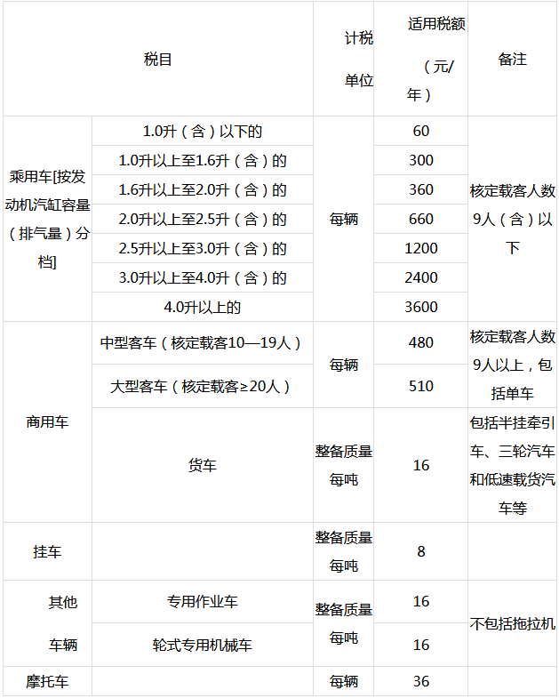 廣東省車輛車船稅適用稅額表