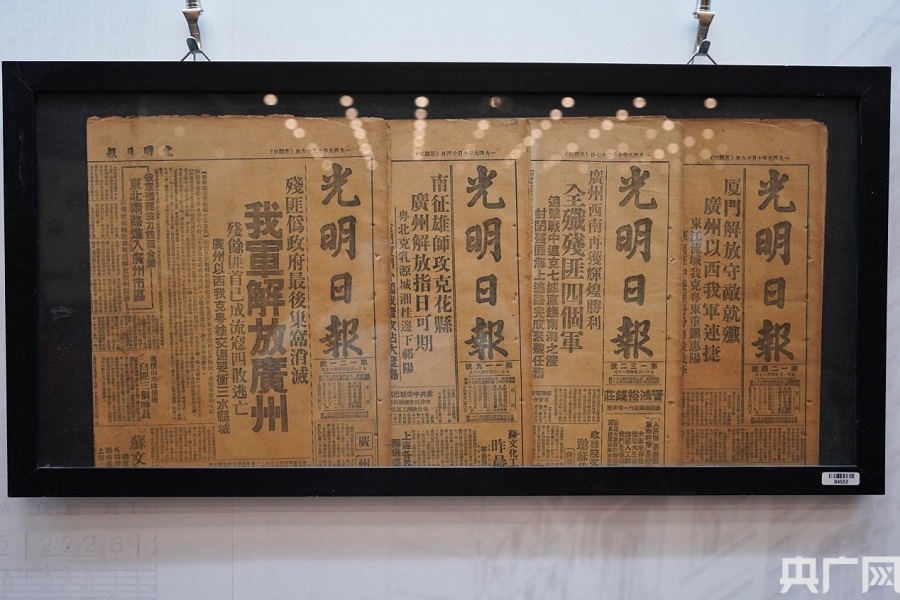 展覽共展出了一百張廣州紅色史跡新舊照片和近百件(套)歷史物件。圖為《光明日報(bào)》頭版報(bào)道解放廣州的系列報(bào)道。(央廣網(wǎng)記者 官文清 攝)