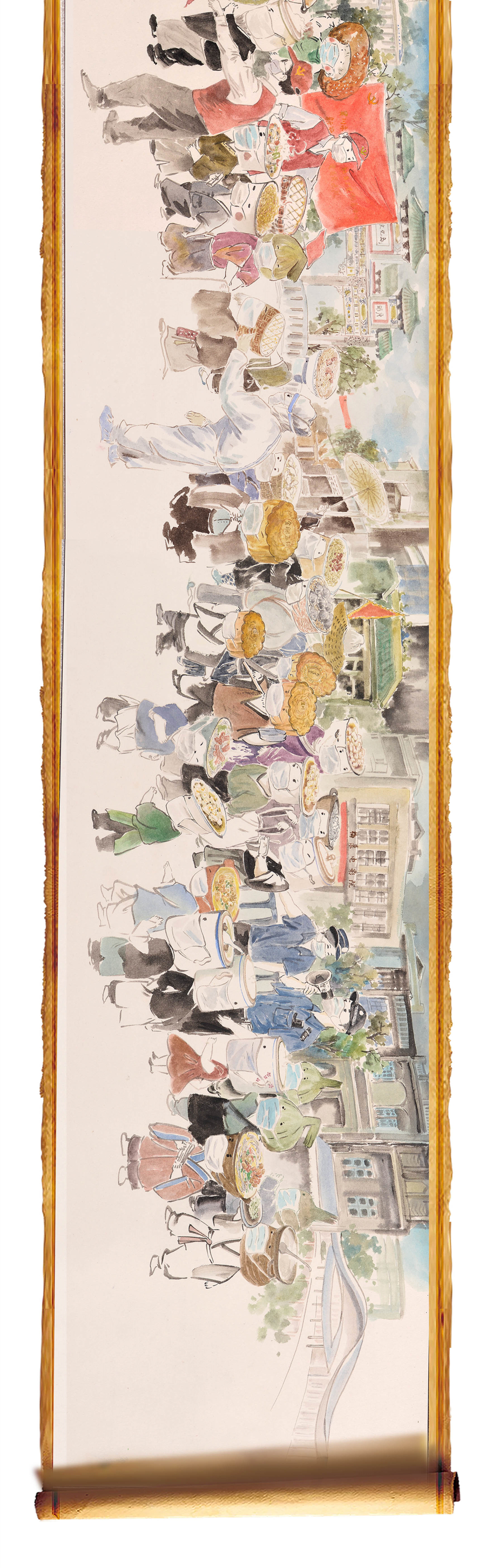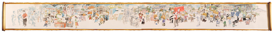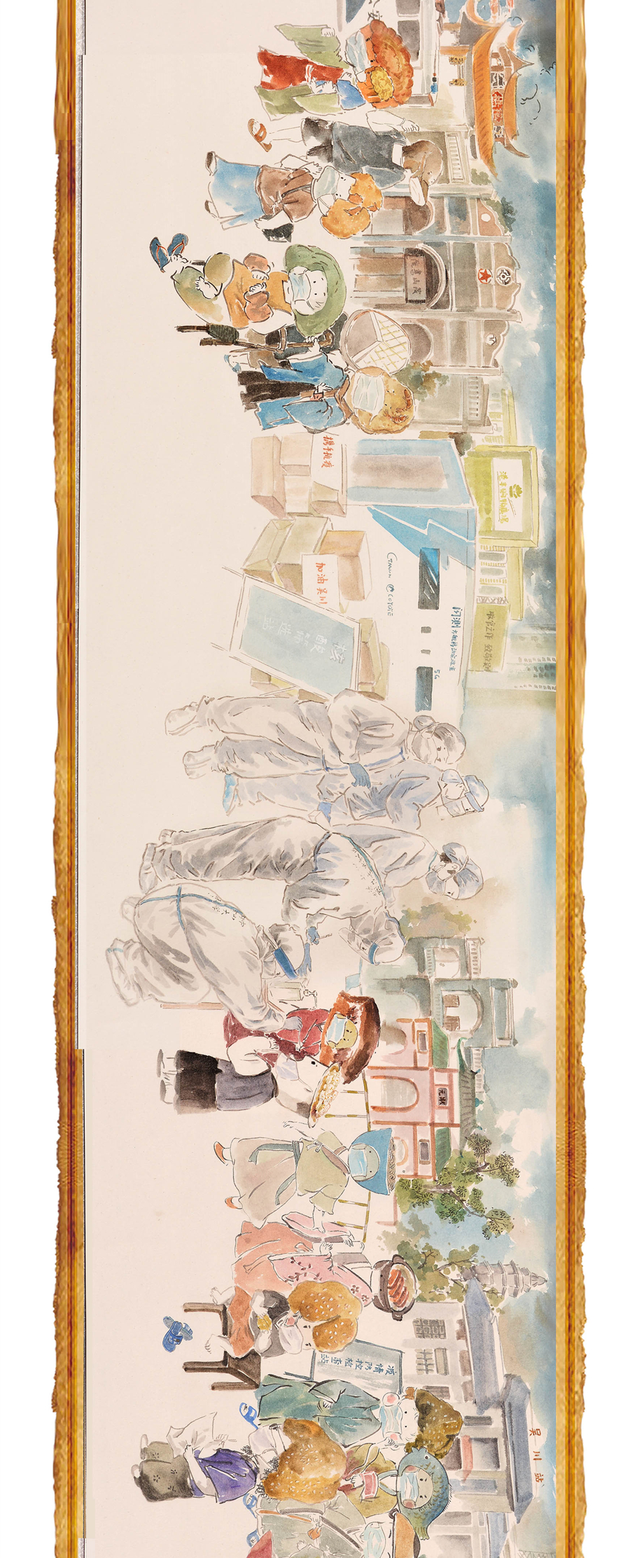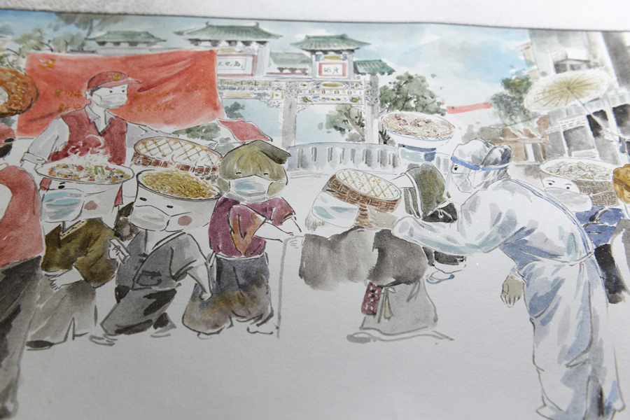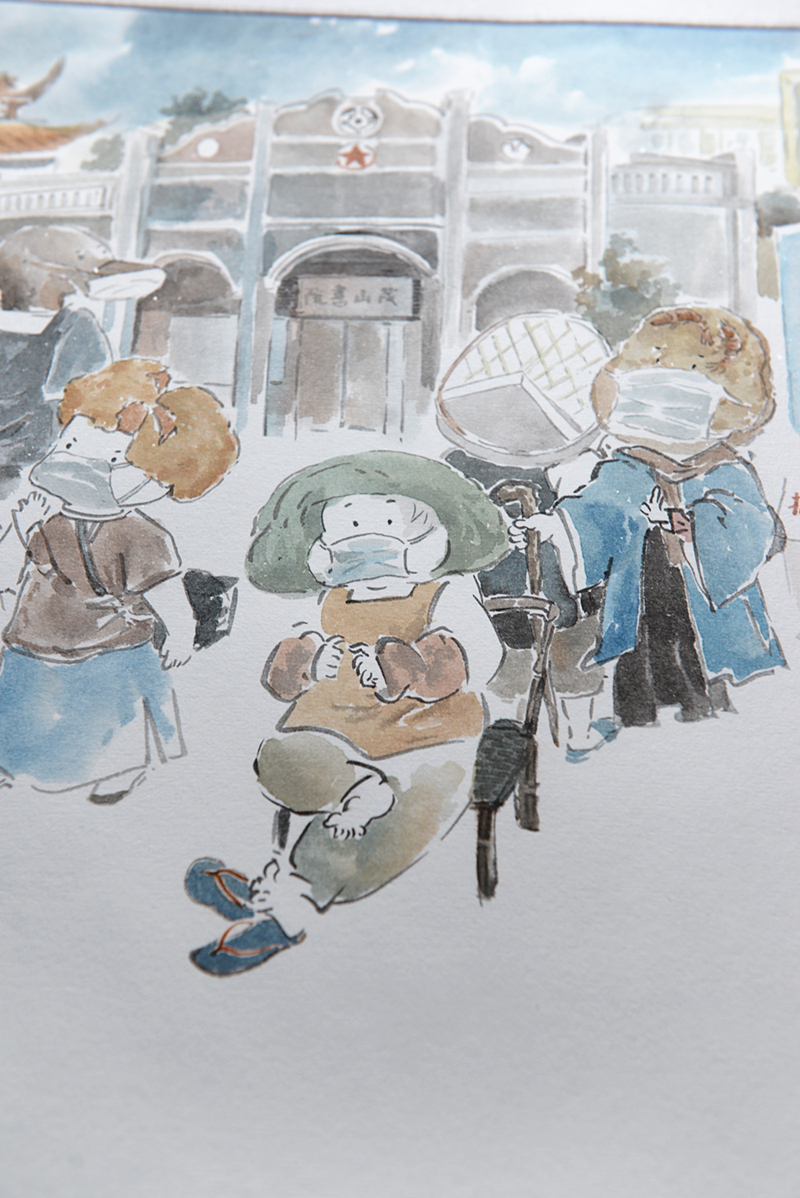 “吳川卷寄托的是我對(duì)家鄉(xiāng)的思念,所以在構(gòu)圖上也會(huì)更直白一些,就是用長(zhǎng)卷的形式,把大家排隊(duì)做核酸的場(chǎng)景表現(xiàn)出來(lái)!标愔窘芙忉屨f(shuō)。