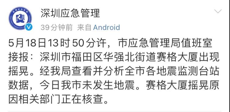 據(jù)網(wǎng)友反映,深圳賽格大廈從中午12點(diǎn)開(kāi)始輕微晃動(dòng),到1點(diǎn)多晃動(dòng)明顯,讓人有頭暈感。