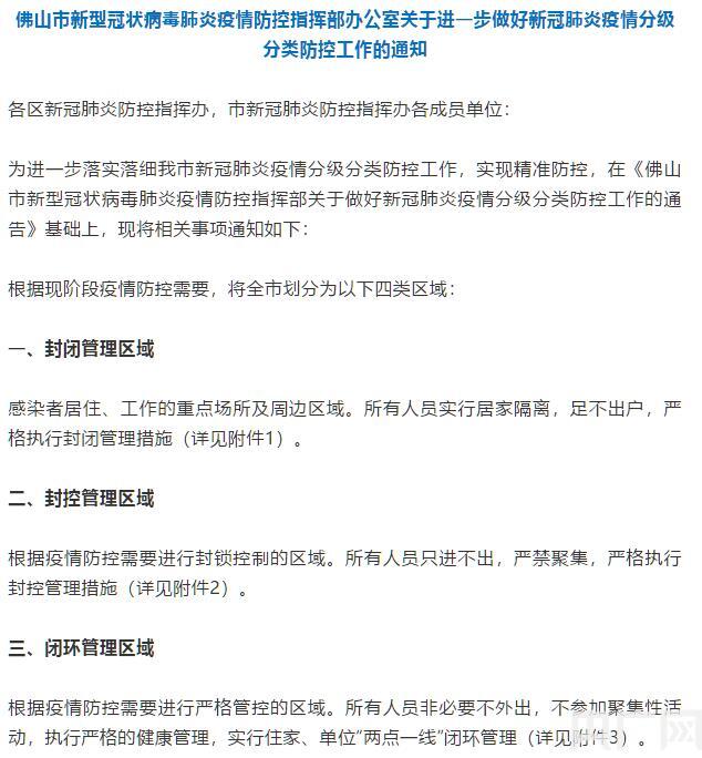 央廣網(wǎng)佛山6月6日消息(記者 夏燕)6月5日晚,佛山市新型冠狀病毒肺炎疫情防控指揮部辦公室發(fā)布通知,即日起實(shí)施分級(jí)分類(lèi)防控,將全市劃分為封閉管理、封控管理、閉環(huán)管理及一般管理共四類(lèi)區(qū)域。