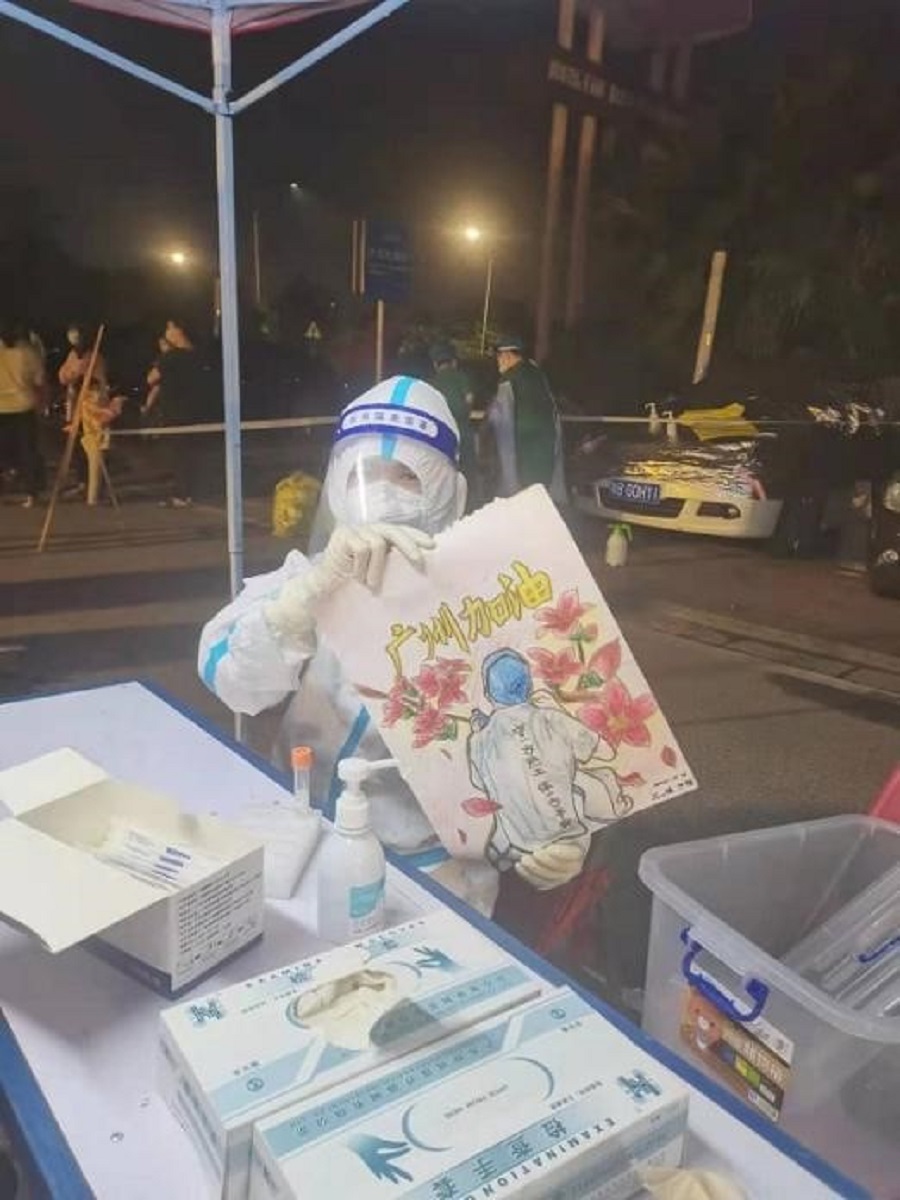 在花都豪駿名苑采樣點(diǎn),市民為醫(yī)護(hù)人員送上暖心畫作,表達(dá)對白衣天使的感謝。