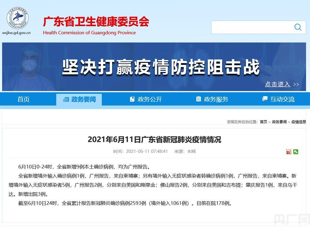 據(jù)廣東省衛(wèi)健委通報:6月10日0-24時,廣東全省新增9例本土確診病例,均為廣州報告。