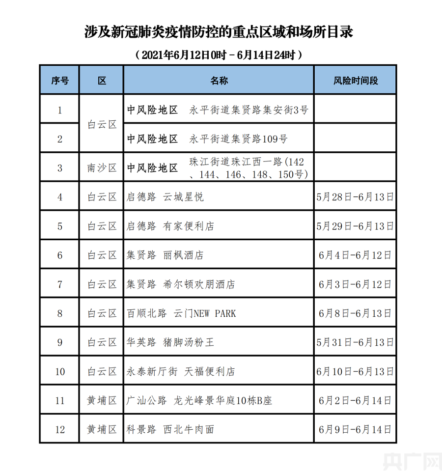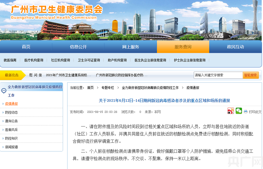 央廣網(wǎng)廣州6月15日消息(記者 張勝強)6月15日晚,廣州市衛(wèi)健委網(wǎng)站發(fā)布了關于2021年6月12日-14日期間新冠病毒感染者涉及的重點區(qū)域和場所的通報: