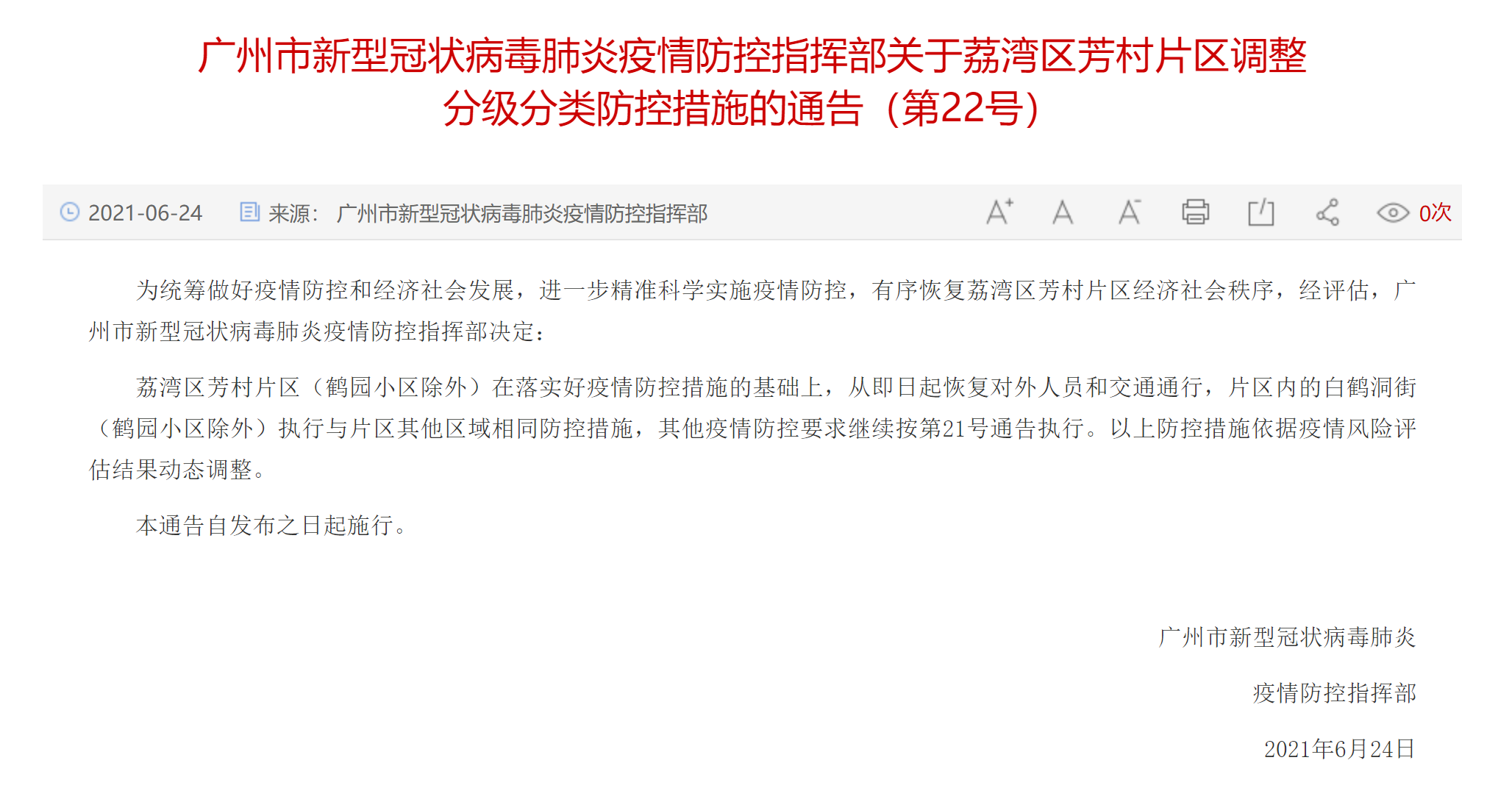 據(jù)通報(bào),6月24日0至24時(shí),廣州無(wú)新增境內(nèi)感染病例報(bào)告,已連續(xù)6日零新增。