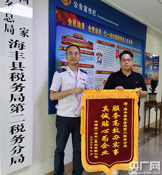 央廣網(wǎng)汕尾10月26日消息(記者官文清 通訊員陳思宇 童振躍)“海豐稅務(wù)人員主動上門指導(dǎo)留抵退稅事宜,僅用兩天時間退稅款就到我們賬戶了,真金白銀落袋,為我們解決了復(fù)工后資金周轉(zhuǎn)的實際困難!苯,華耀城(海豐)置業(yè)有限公司將一面印有“服務(wù)高效辦實事,真誠貼心為企業(yè)”的錦旗送至海豐縣稅務(wù)局第二稅務(wù)分局,對稅務(wù)人員真誠貼心、全面提速為企業(yè)排憂解難的服務(wù)表示充分肯定及衷心感謝。