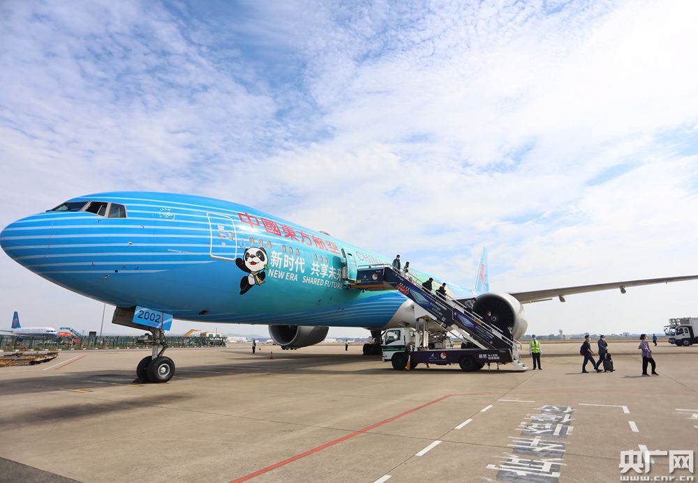 東航主題彩繪飛機(jī)“進(jìn)博號(hào)”首航廣州。(央廣網(wǎng)發(fā) 通訊員供圖)