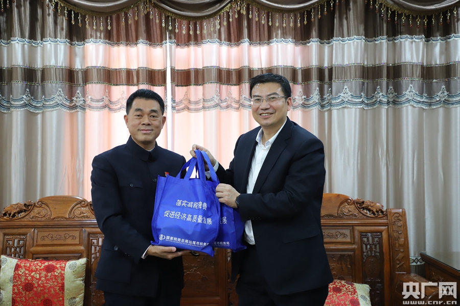 汕尾市稅務(wù)局黨委委員、總經(jīng)濟(jì)師郭郁(右)為全國(guó)人大代表李金東(左)送上稅費(fèi)政策大禮包。(央廣網(wǎng)發(fā))
