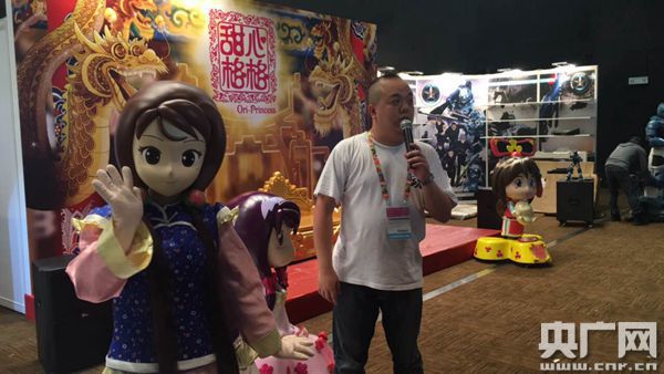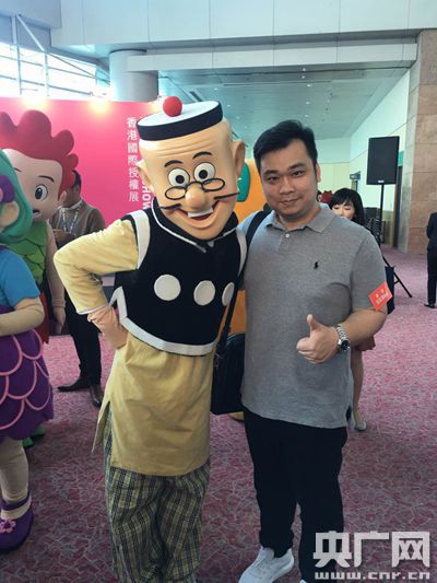 經(jīng)典漫畫人物老夫子公仔與央廣記者周偉琪合照
