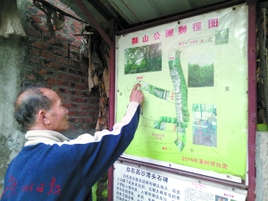 在這座祖墳山的上山路入口處,掛著一張潘樹照去年繪制的《獅山公園獅徑圖》。從地圖上看,山上共修了四條路,一條是主路,被命名為獅徑,另外三條為輔路,分別被起了頗含深意的名字,“根源路”,“永昌路”,“報(bào)德路”,在一些道路上,還有景點(diǎn)設(shè)置。
