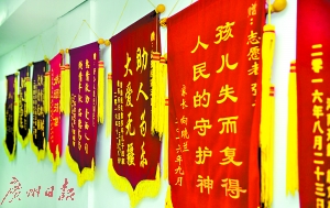在東莞塘廈鎮(zhèn)的一處僻靜的小門店,是“讓愛回家”志愿者服務(wù)隊的臨時辦公室。這是去年5月,張世偉花950元租下的,墻壁上掛滿了多年來經(jīng)他幫助回家的流浪人員家屬送的錦旗。“我們最近幾年已經(jīng)不收錦旗了,太多了,根本沒地方放!比缃,加入他團隊的志愿者越來越多,達到3000名。