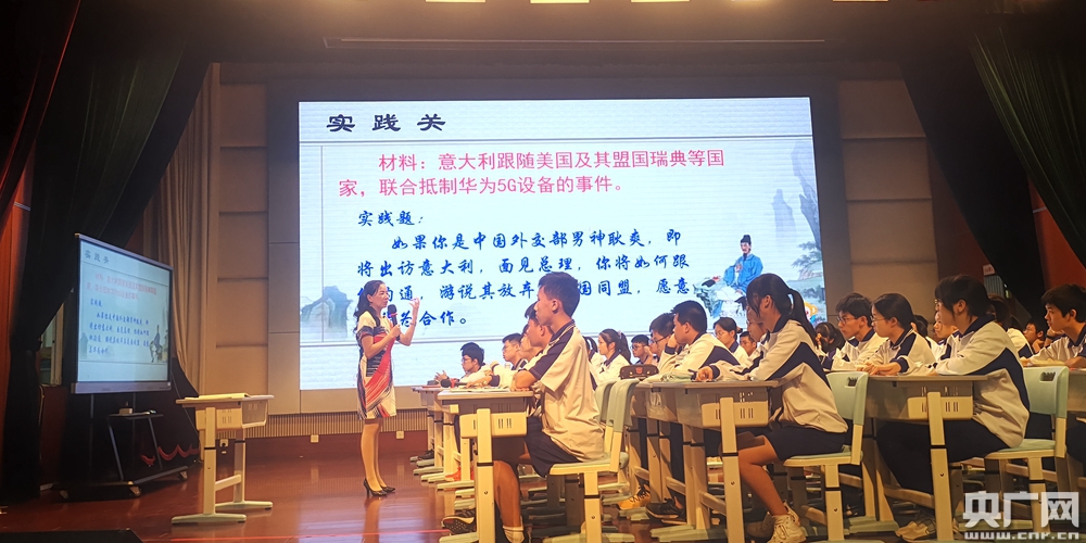儀式結(jié)束后,一堂“深度教學(xué)”語文示范課引起了在場(chǎng)學(xué)生家長(zhǎng)的強(qiáng)烈興趣。老師在講述“燭之武退秦師”這一課時(shí),用微視頻、PPT、小組討論、學(xué)生發(fā)言并辯論等方式,讓學(xué)生深度參與課堂,效果良好。更難得的是,老師在最后還出了一道時(shí)事題,引導(dǎo)學(xué)生參考燭之武游說秦國(guó)退師的語言表達(dá),讓學(xué)生化身外交官,去說服意大利總理繼續(xù)使用華為的5G設(shè)備。這一堂課深入淺出,集語文、歷史、時(shí)事、政治于一身,讓家長(zhǎng)們對(duì)“深度教學(xué)”理念更加期待。