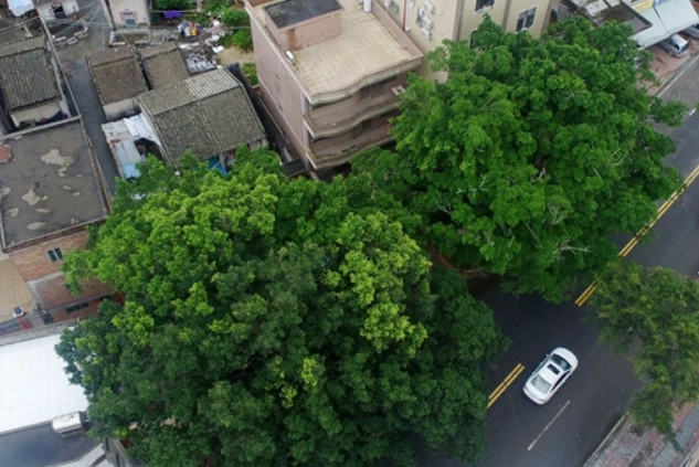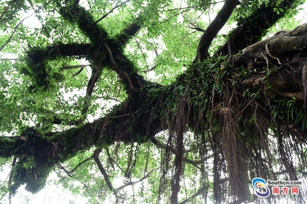 在佛園村佛嶺村民小組的老村莊入口,兩棵參天古榕樹一左一右分立路邊,枝繁葉茂,形似一道拱門,為往來村民遮陰避陽,也如同衛(wèi)兵守護著村莊。這兩棵古榕樹均為細葉榕,右邊的較大的榕樹已有500多年樹齡,左邊的有200多年樹齡。